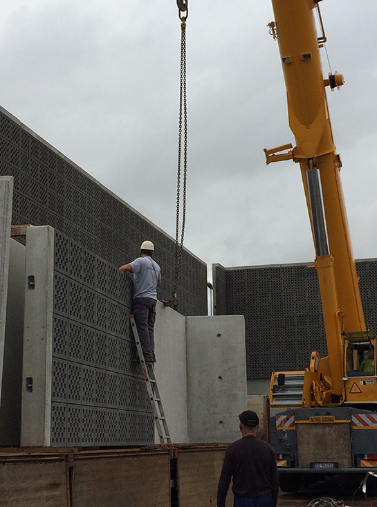 L’intervento di bonifica acustica che qui presentiamo con alcune immagini fotografiche ha richiesto, per l’intensità del rumore creato dai mezzi di lavorazione nel piazzale, la costruzione di una barriera acustica alta otto metri e lunga ben centosettanta, con alte proprietà acustiche sia Fonoisolanti, sia Fonoassorbenti a tale scopo sono state utilizzate delle particolari formelle in calcestruzzo d’argilla espansa leca denominate Fonoleca Quadro, molto performanti alle medie ed alte frequenze.